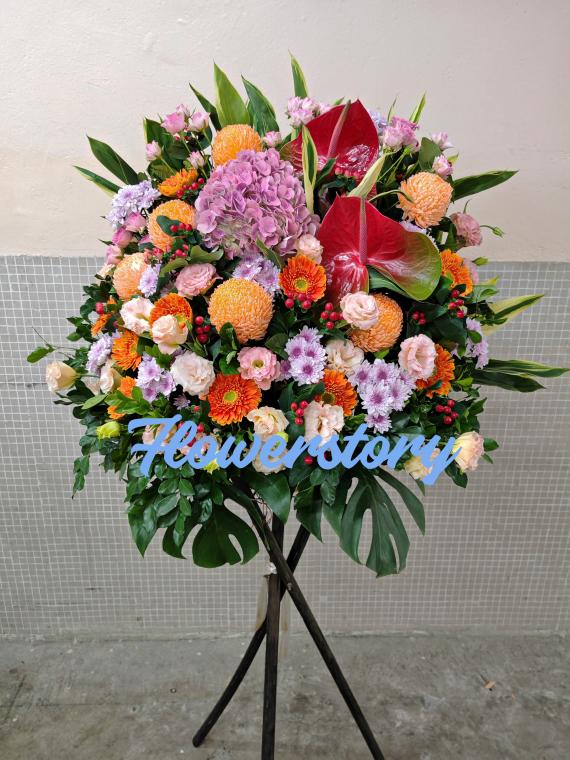 價格:$1,880.- 說明:紅掌,橙太陽菊,黃玫瑰,綠西施菊,藍繡球,青桔梗,紫色萬代蘭
