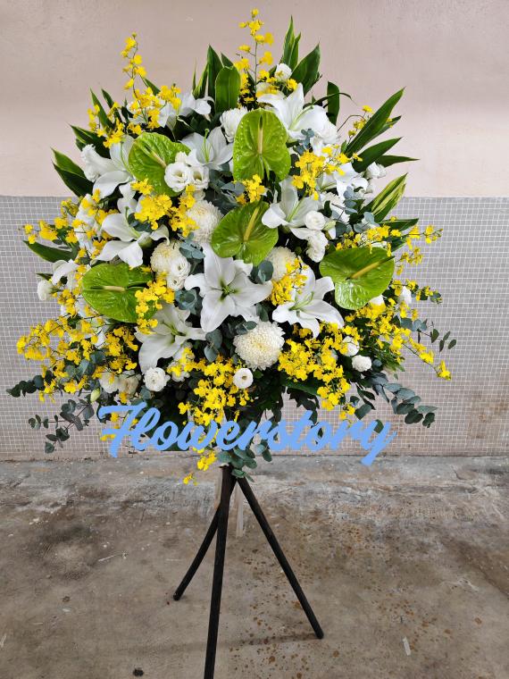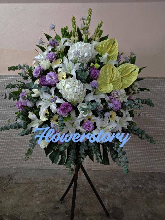 價格:$1,880.- 說明:5呎高圈,白丁,粉玫瑰,白玫瑰,白百合,青桔梗
