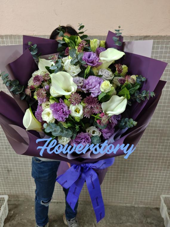 價格:$680.- 說明:紫繡球,淺紫桔梗,羽絨葉,紫蘇,多頭鳳尾